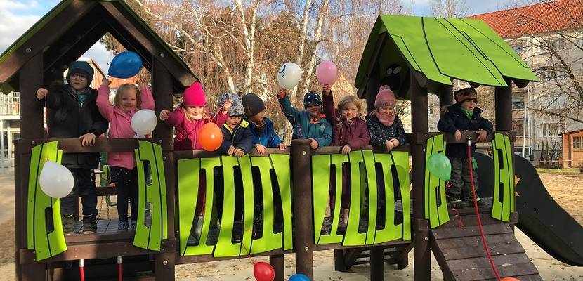 Jungen und Mädchen der Kita „Waldblick II“ unterstreichen ihre Freude über die neue Kletterrutsche mit bunten Luftballons.