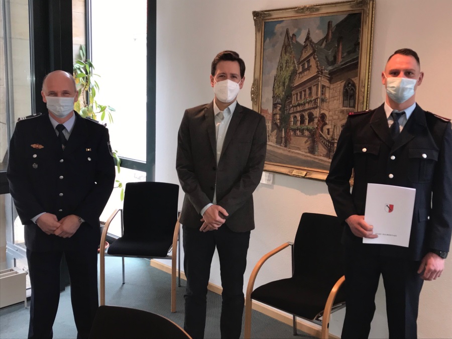 Heute (24. März 2021) wurde der Brandmeister Johannes Herrschaft mit Wirkung vom 1. April 2021 zum Beamten auf Lebenszeit ernannt. Die Ernennungsurkunde überreichte ihm Oberbürgermeister Daniel Szarata im Beisein von Ingo Wetzel, Leiter der Halberstädter Feuerwehr, im Rathaus der Stadt. Johannes Herrschaft hat seine Ausbildung bei der Stadt Halberstadt absolviert und erfolgreich abgeschlossen. Eine dreijährige Probezeit als Brandmeister auf Probe mit entsprechend guten Beurteilungen waren die Voraussetzungen für die Ernennung zum Beamten auf Lebenszeit.