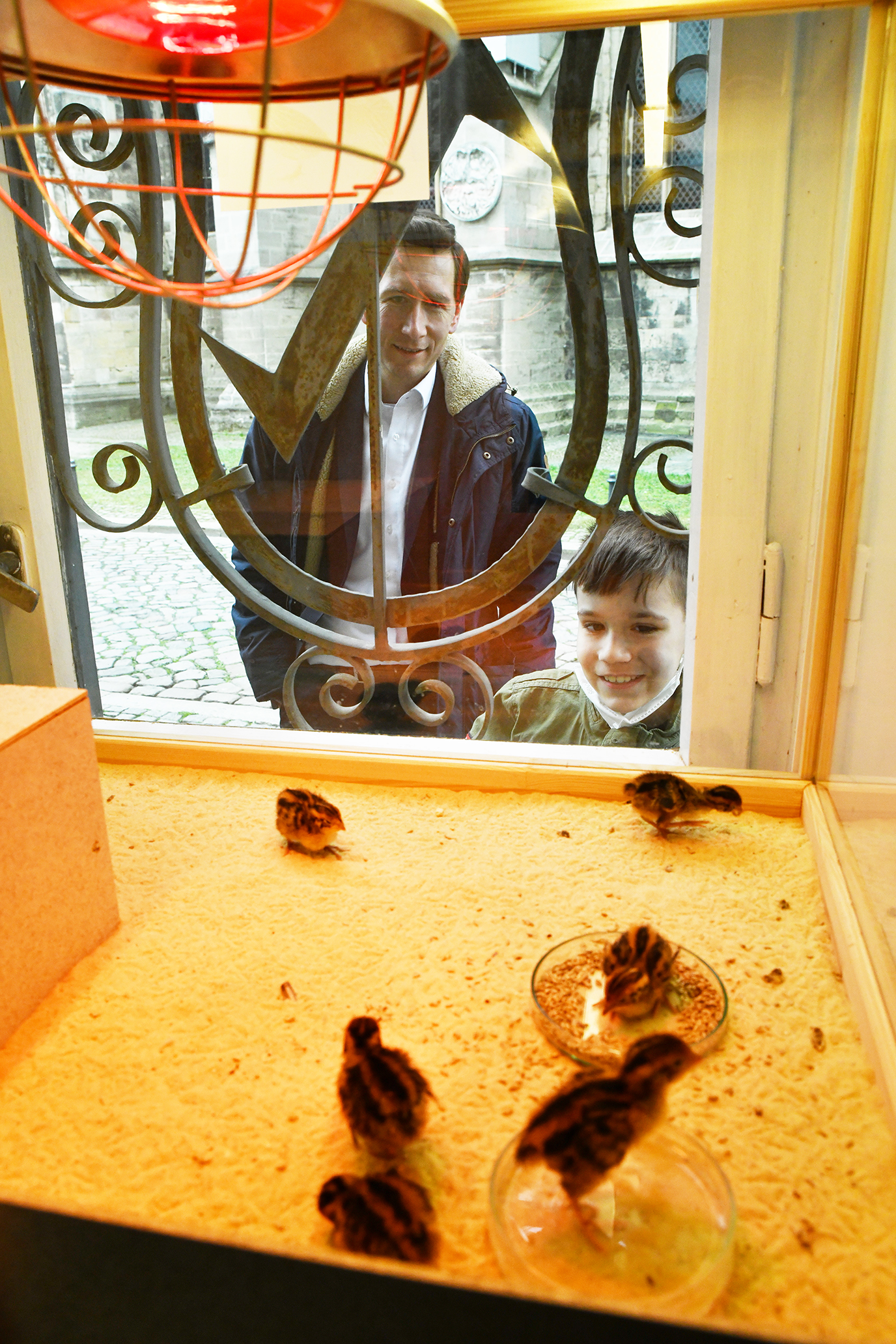 Oberbürgermeister Daniel Szarata ließ es sich nicht nehmen, persönlich am Freitag am Schaufenster vorbeizuschauen. Zusammen mit dem Chef des Vogelkundemuseums Rüdiger Becker und Tiergartenleiter David Neubert begrüßte er die frisch geschlüpften Küken. Rüdiger Becker berichtete dabei ein wenig über die „Welt der Wachteln“.