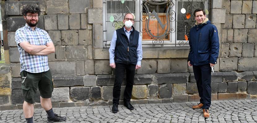 Bildunterschrift oben: v. l. n. r: David Neubert, Tiergartenleiter, Rüdiger Becker, Museumsdirektor des Heineanums und Oberbürgermeister Daniel Szarata vor dem Schaufenster mit den Wachtelküken