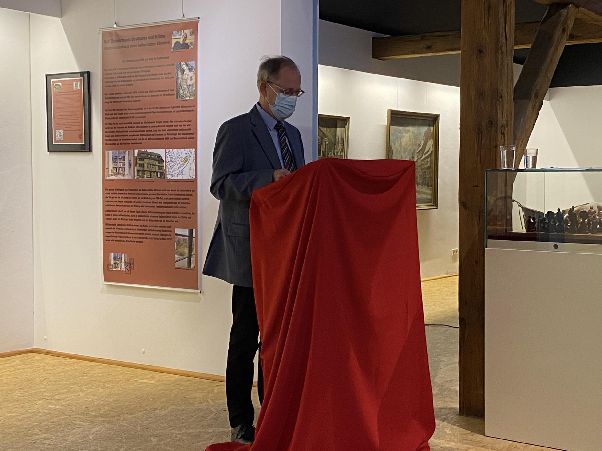 Dirk Wasmund, Sohn Rolf Zimmermanns und selbst Künstler, umrahmte mit seiner Band die Ausstellungseröffnung musikalisch. Stadtratspräsident und Vorsitzender des Geschichtsvereins, Dr. Volker Bürger, eröffnete die Ausstellung mit einem Grußwort.