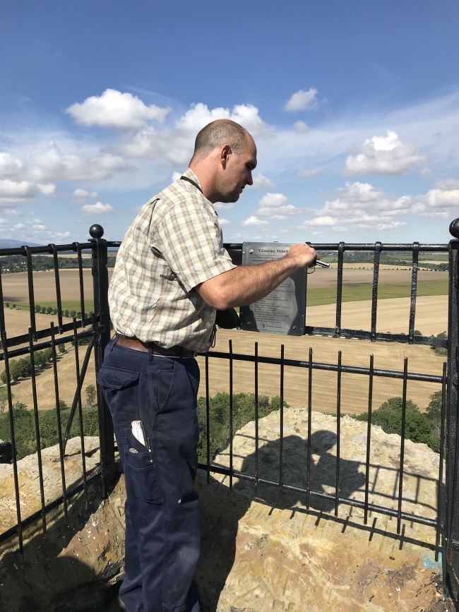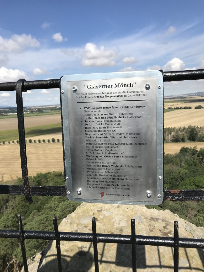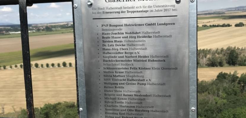 Die beschädigte Sponsorentafel am Gläsernen Mönch konnte dank der Unterstützung durch den Schlossermeister Felix Kästner, Michael Brexendorff und den Verein Halberstädter Berge e.V. durch eine neue Tafel ersetzt werden.