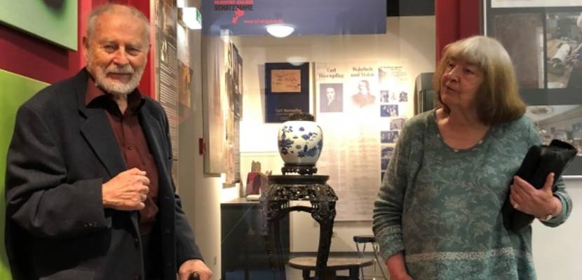 Bildunterschrift: Frau Dr. Giesela Laschkewitz-Brehm und Peter Laschkewitz vor „ihrer“ Ausstellung im Schraube-Museum, „Reiselust, Entdeckerfreunde und Sinn für schöne Dinge“.