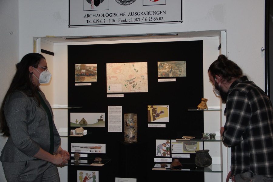 Um die Gestaltung der Vitrinen zu erneuern, wurden nicht nur neue Grafiken erstellt, wie z. B. ein großformatiger Plan, auf dem sämtliche Ausgrabungsergebnisse der 1990er Jahre vor dem Hintergrund der Vorkriegsbebauung zu sehen sind, sondern auch bisher noch nie gezeigte Objekte ausgewählt. Bemerkenswert ist hierbei, dass durch diese zum Teil einmaligen Funde an so zentraler Stelle – sozusagen am uralten Herz der Stadt – Halberstadt eine wichtige Stellung innerhalb der Stadtarchäologie über die Grenzen Sachsen-Anhalts hinaus einnimmt. Tobias Schoo, Mitarbeiter des Sammlungsbereichs Archäologie, der die Neupräsentation gestaltet hat, zeigt begeistert die überarbeitete Dauerausstellung.