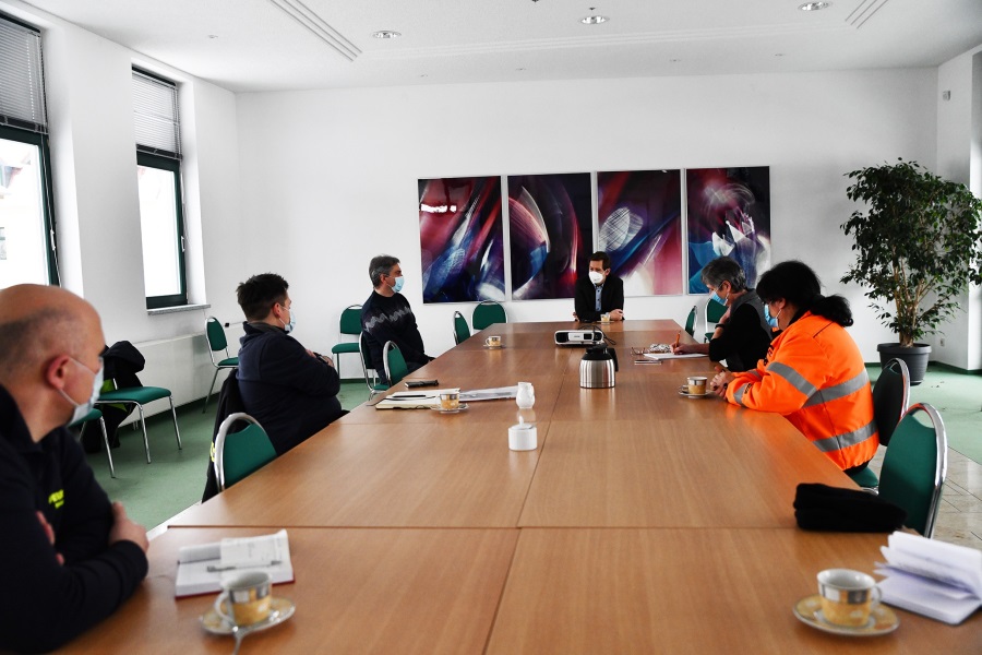 Stala-Runde zur Schneeberäumung und möglichem Hochwasser: (von links) Candy Eitz und Michael Festerling von der Feuerwehr, Thomas Dittmer, Ordnungsabteilung, Oberbürgermeister Daniel Szarata, Stala-Chefin Ulrike Lemme und Kathleen Leimberg vom Stala.