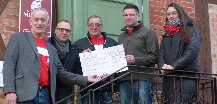 FOTO: Ortsbürgermeister Jens Müller (von links), Oberbürgermeister Andreas Henke, Knut Kothe (Kassenwart des Volleyballvereins), Andy Knopp (Vorsitzender des Volleyballvereins) und Dr. Antje Gornig (Leiterin Städtisches Museum) bei der Übergabe der Spende.