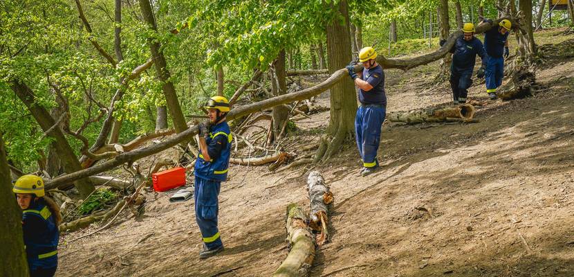 Am letzten Samstag, den 27. April, hat der THW Ortsverband Halberstadt im Rahmen des Frühjahrsputzes einen Einsatz im Tiergarten durchgeführt. Vorbereitend wurden bereits am 16. März während eines Einsatzes die Zufahrten und Wegungen des Tiergartens beräumt. Das Hirschgehege war seit dem schweren Sturm Friederike im Januar 2018 in einem sehr desolaten Zustand. Aus diesem Anlass baten wir, das Team des Tiergartens, das THW um Unterstützung beim Aufräumen des Geheges sowie bei der Sicherung des dortigen Hanges. Nach einer Begehung vor Ort übernahm das THW diese schwierige Aufgabe und plante beide Einsätze.