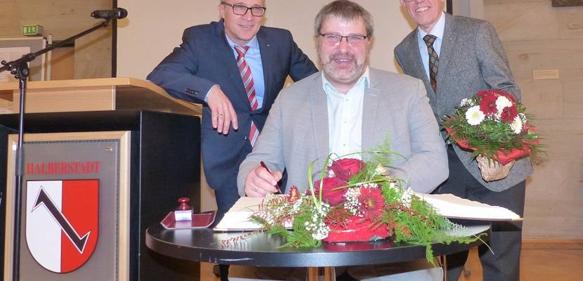 Sichtlich überrascht und gerührt nahm Dr. Frank Aedtner die Auszeichnung mit der Verdienstmedaille der Stadt durch den Stadtratspräsidenten Dr. Volker Bürger (rechts) und Oberbürgermeister Andreas Henke (links) entgegen. (Foto: Ute Huch/Pressestelle/Stadt Halberstadt)