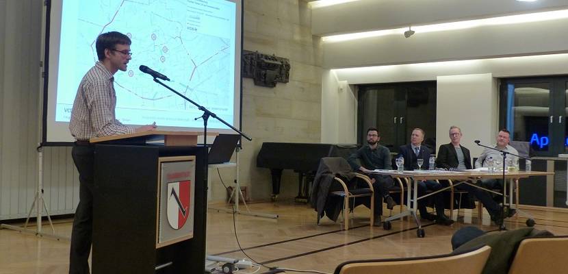 Christoph Bochmann, Projektleiter vom Ingenieurbüro Buschmann GmbH Magdeburg/Verkehrsconsult Dresden-Berlin GmbH (VCDB) stellt im Rathaus das neue Verkehrskonzept vor.