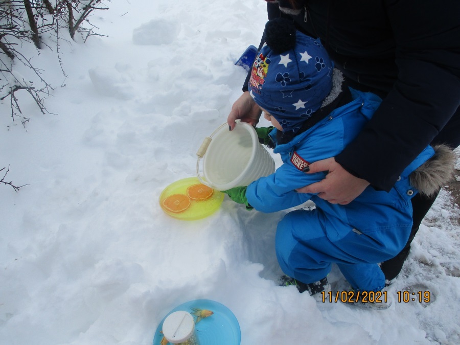 „Sonnenschein“ in Ströbeck. Die weiße Pracht der letzten Tage bot viele Ideen zum Experimentieren. Schneekunst entstand mit einfachen Wasserfarben und Pinseln. Außerdem haben die Kinder die frostigen Temperaturen genutzt, um schöne Eisbilder mit Glitzer, Orangenscheiben, Farbe und Naturmaterialien entstehen zu lassen. Alle waren beim Herstellen mit Feuereifer dabei und von den Ergebnissen sichtlich begeistert.