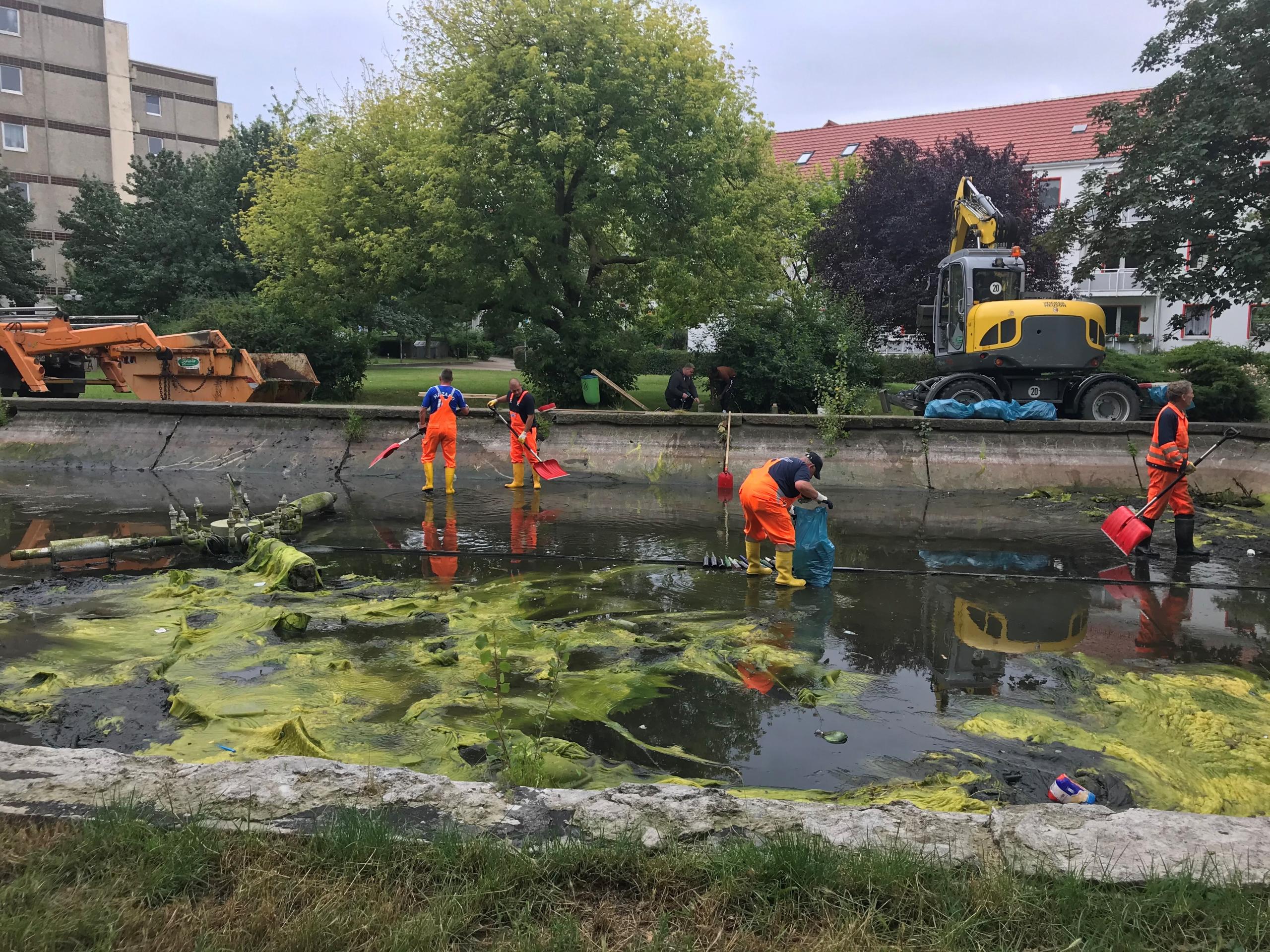Gleichzeitig hat die Stadt diesen Arbeitseinsatz am Donnerstag genutzt und durch den Stadt- und Landschaftspflegebetrieb (Stala) und die Abwassergesellschaft GmbH (AWH) das Brunnenbecken säubern und das angesammelte Regenwasser abpumpen lassen. So waren am Donnerstag Mitarbeiter des Stala und der AWH mit großem Gewerk und Maschinen im Einsatz und holten Unmengen von Müll aus dem Brunnenbecken.