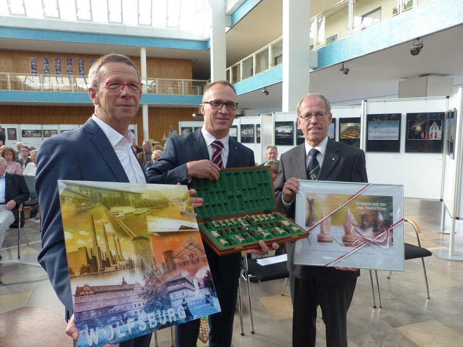 „Unsere Aufgabe ist es, die nachwachsenden Generationen von der Bedeutung unserer Partnerschaft zu überzeugen, damit sie diese Verbindung pflegen“, hob Halberstadts Oberbürgermeister Andreas Henke hervor, der ebenso wie sein Amtskollege sehr positiv auf dieses Städtebündnis blickte. Als Zeichen der Freundschaft und Verbundenheit überreichte Andreas Henke an Klaus Mohrs mit Blick auf die mehr als 1000jährige Schachtradition Halberstadts und seines Ortsteils „Schachdorf Ströbeck“ ein ganz besonderes Gastgeschenk: Ein Schachspiel, in dem die Springer durch Wölfe als Symbol für die Volkswagenstadt und die schwergewichtigen Türme durch die Halberstädter Martinikirche ersetzt worden sind. Im „Gegenzug“ schenkte Klaus Mohrs der Stadt Halberstadt eine künstlerisch ansprechende Fotocollage mit den wichtigsten Bauwerken der Stadt Wolfsburg.