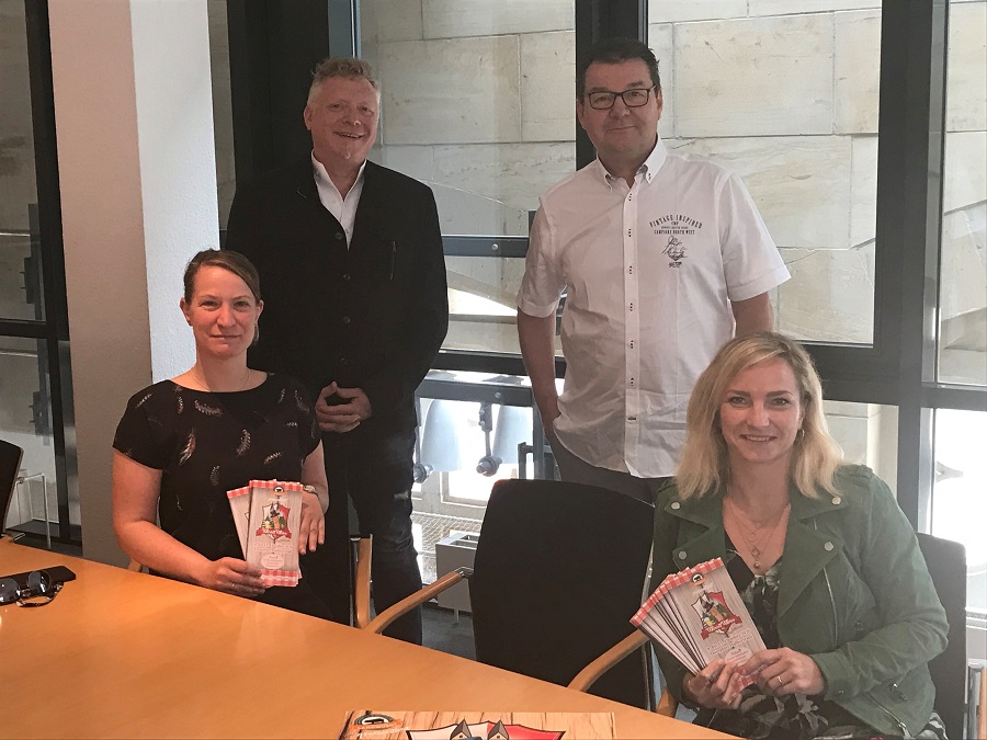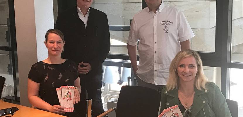 Bildunterschrift: Monika Klytta (vorne links) von der Halberstadt Information und Stadtmarketingmanagerin Nancy Schönknecht sowie Andreas Schmidt, der den Wiesn-Song komponiert und produziert, und Jens-Uwe Jahns, Inhaber von cityPress und Mitveranstalter, werben für den neuen Termin der WürstlWiesn vom 8. bis 10. Oktober 2021.