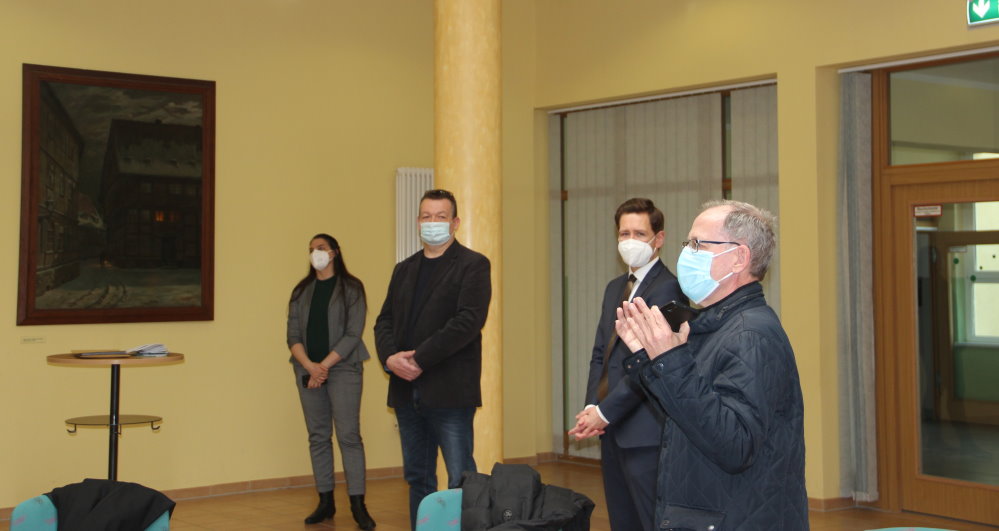 Foto 2: v. l. n. r.: Dr. Antje Gornig (Museumsleiterin), Hanno Nowak (Schuldirektor), Daniel Szarata (Oberbürgermeister) und Dr. Volker Bürger (Vorsitzender Geschichtsverein) im Gespräch mit den Schülerinnen und Schüler der Sekundarschule Walter Gemm.
