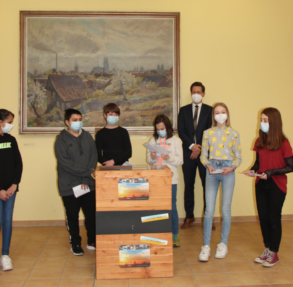 Schülerinnen und Schüler der Klassen 6a, 6b und 7a wurden von Oberbürgermeister Daniel Szarata, dem Vorsitzenden des Geschichtsvereins Dr. Volker Bürger, der Museumsleiterin Dr. Antje Gornig und dem Schuldirektor Hanno Nowak in der Aula der Sekundarschule begrüßt.
