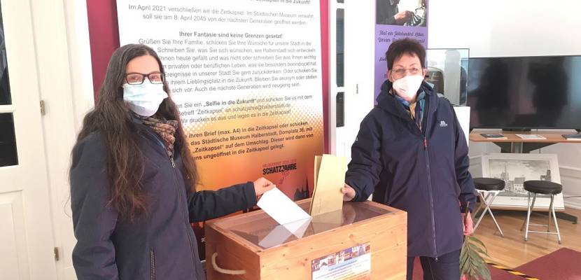 Nachdem schon Politiker und Stadträte dem Aufruf, die Zeitkapsel zu füllen, zahlreich folgten, haben nun auch die ehemalige Leiterin des Kulturbüros, Sabine Moczko, und die aktuelle neue Amtsinhaberin, Dr. Sandra Salomo, kürzlich im Museum ihre Botschaft für die Zeitkapsel übergeben. So hofft Sabine Moczko, „dass die Menschen auch 2045 noch gern in die Halberstädter Museen und ins Theater gehen werden, dass sie auch weiterhin stolz auf ihre Kultur und ihre Stadt sind.“ Sie ist sicher, „dass es auch in 24 Jahren noch eine bedeutungsvolle Kultur in Halberstadt geben wird“.