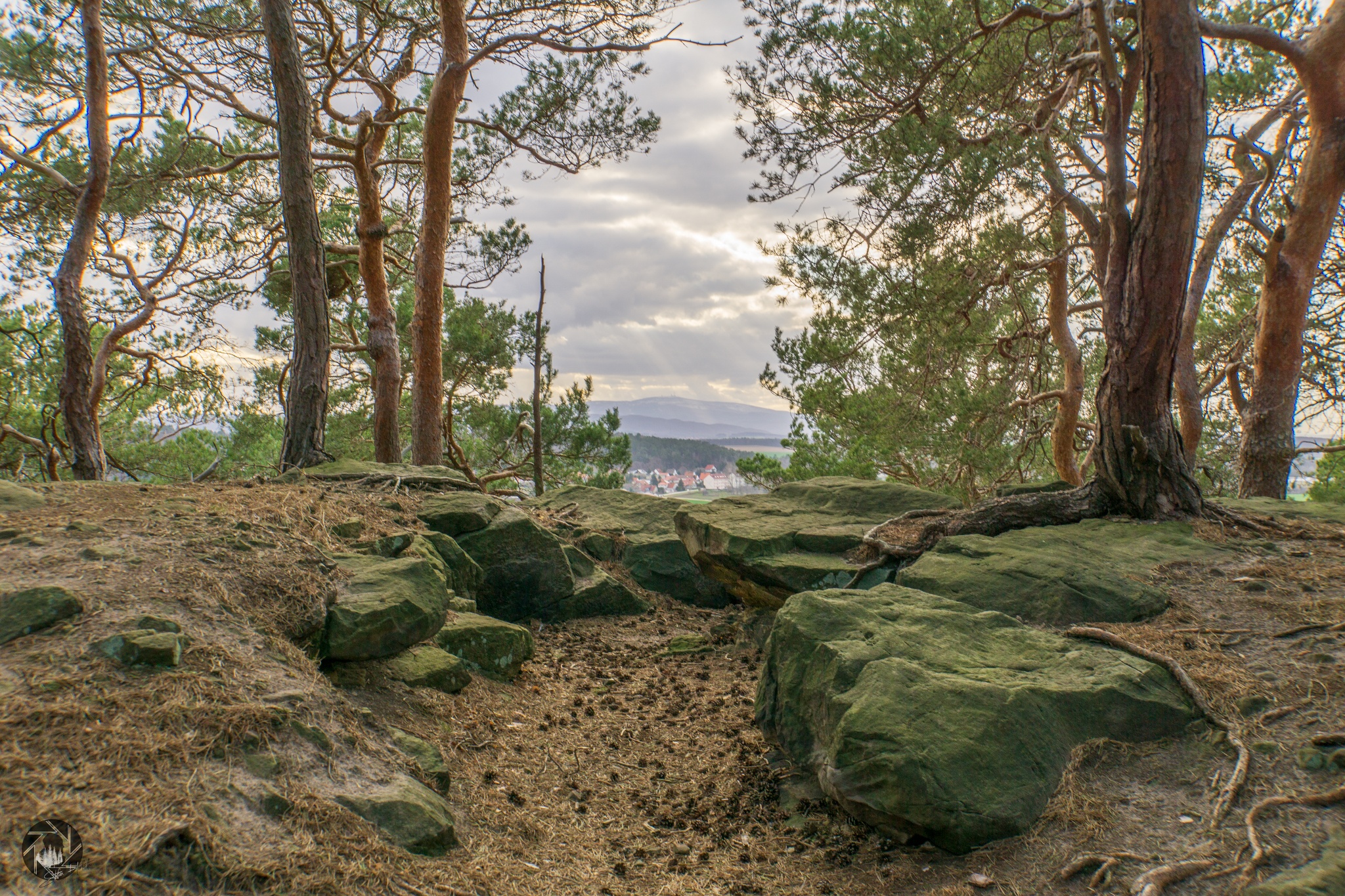 Von der Kalten Warte geht es geradeaus weiter zur Fuchsklippe. Dort steht auch ein roter Stempelkasten und es befindet sich dort eine Sitzgelegenheit, die wieder einen tollen Ausblick bietet.