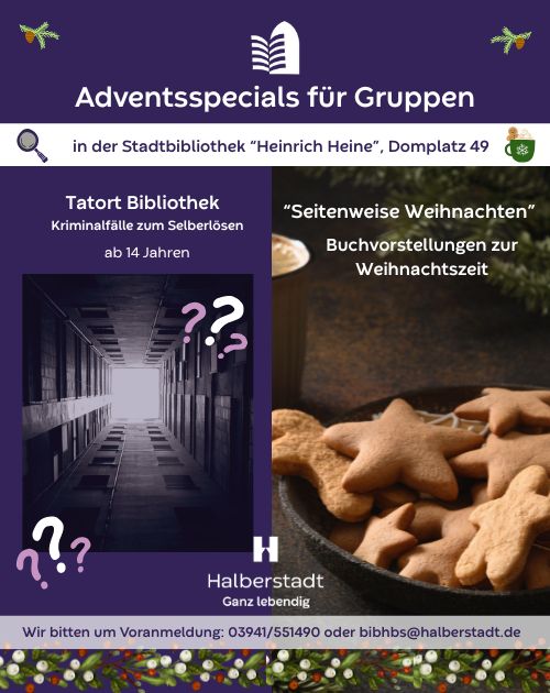 In der Adventszeit verwandelt sich die Stadtbibliothek ,,Heinrich Heine“ in Halberstadt zu einem Zentrum für Spürnasen und Hobbydetektive. Unter dem Motto ,,Tatort Bibliothek“ lädt das Adventsspecial dazu ein, spannende Kriminalfälle zu lösen und bietet Gruppen von Hobbydetektiven die Möglichkeit, in die Rolle der Ermittler zu schlüpfen, die Fallakten zu studieren und Spuren zu analysieren. Mit Teamarbeit und einem guten Gespür für Zusammenhänge kann die Wahrheit ans Licht gebracht werden. Eine Auswahl unterschiedlicher Fälle zum Miträtseln bietet ein ganz besonderes Erlebnis für alle, die die Vorweihnachtszeit einmal anders gestalten möchten – gemeinsam, spannend und voller Rätsel.