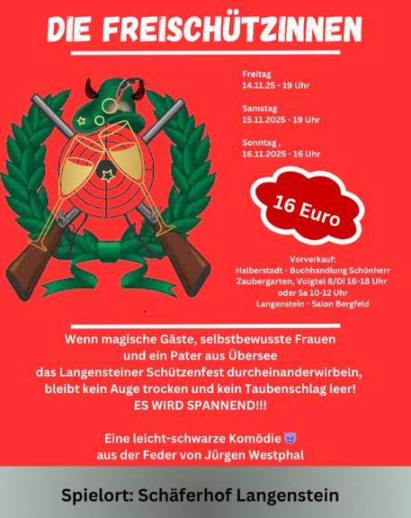 Die Halberstädter Spielgemeinschaft präsentiert eine turbulente Komödie rund um ein Schützenfest, das völlig aus dem Ruder läuft. Mit Witz, Charme und unerwarteten Wendungen sorgen vier selbstbewusste Frauen und ein skurriles Dorfensemble für beste Unterhaltung.