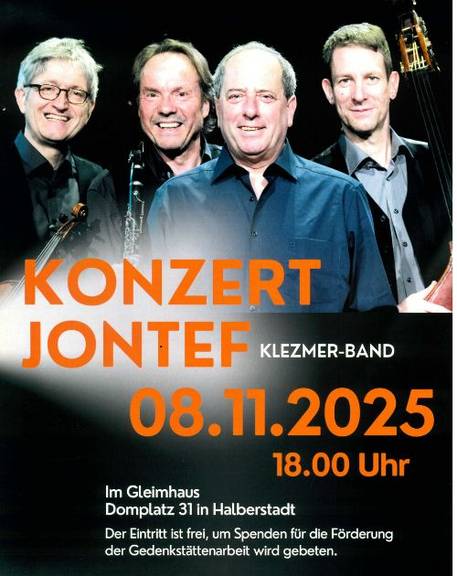 „Noten für Namen“ – schon vor längerer Zeit hat der Förderverein der Gedenkstätte Langenstein – Zwieberge e. V. diese Benefizkonzertreihe aus der Taufe gehoben, um Namenstafel für Häftlinge anbringen zu lassen, die in dem einstigen Konzentrationslager ermordet wurden. Schon mehrfach haben diese Konzerte im Gleimhaus stattgefunden, und so auch diesmal wieder der Auftritt der Tübinger Klezmer-Band „Jontef“.