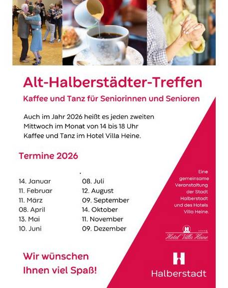 Stadt Halberstadt lädt zu einem geselligen Beisammensein bei Kaffee und Tanz in das Hotel „Villa Heine“ ein.