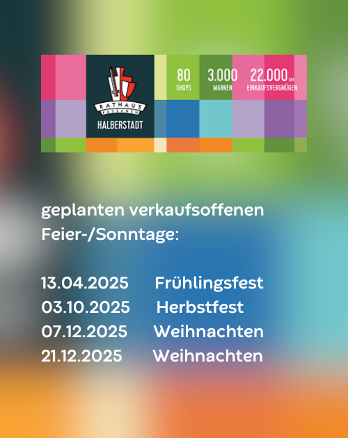Veranstaltung mit barrieregerechtem Zugang | Volksfeste, Märkte VERKAUFSOFFENER SONNTAG 07.12.2025 Alle Termine 07.12.2025 (Sonntag) 21.12.2025 (Sonntag) nähere Informationen folgen Veranstaltungsort(e) Rathauspassagen 38820 Halberstadt Fischmarkt Tel 03941 573780 Fax 03941 5737830 E-Mail info [at] rathauspassagen-halberstadt.de