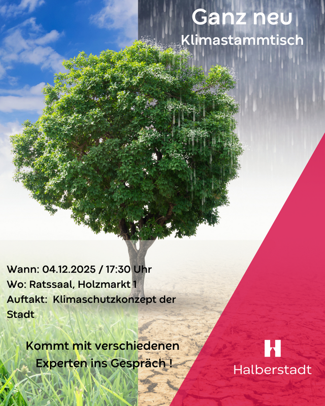 04.12.2025 von 17:30 Uhr bis 19:30 UhrHalberstadt startet ein neues Beteiligungsformat rund ums Thema Klimaschutz. Am 4. Dezember lädt die Stadt von 17.30 bis 19.30 Uhr zum ersten Klimastammtisch in den Ratssaal ein. Organisiert wird die Veranstaltung vom Klimaschutzmanager Sibo Schlicht.