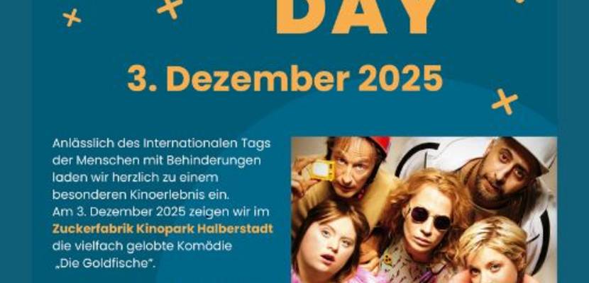 03.12.2025 ab 10:00 UhrAnlässlich des Internationalen Tags der Menschen mit Behinderungen lädt das Projekt Miteinander.Mittendrin. Barrierefrei in Halberstadt zu einem besonderen Kinoerlebnis ein. Am 3. Dezember 2025 wird im Zuckerfabrik Kinopark Halberstadt die vielfach gelobte Komödie „Die Goldfische“ gezeigt – und das gleich in zwei Vorstellungen um 10:00 Uhr und 18:00 Uhr. Freuen Sie sich auf einen inklusiven Kinotag voller Begegnungen, Austausch und guter Unterhaltung.