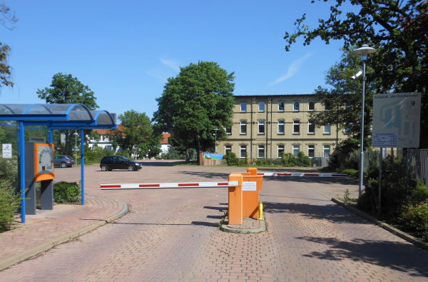 Beschaffenheit: gepflasterte Fläche, beleuchtet, Parkplatz mit Schranke
