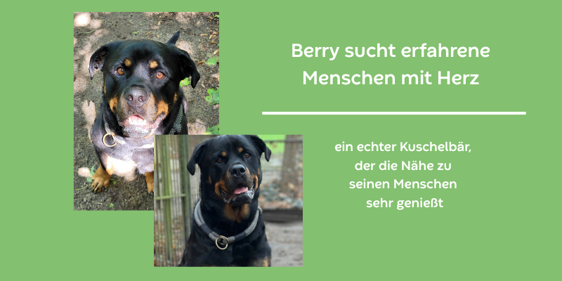 Der fünfjährige Rottweiler-Rüde Berry ist ein echter Kuschelbär, der die Nähe zu seinen Menschen sehr genießt. Fremden gegenüber zeigt er sich freundlich und aufgeschlossen, ist lernfähig und arbeitet gern mit seinem Menschen zusammen.